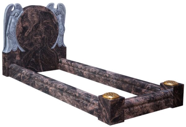 The WG117 Cemetery Kerb Set Memorial features exquisitely carved angels on the headstone and elegant roll-top kerbs with vase posts. This ornate tribute symbolises divine guidance and creates a lasting memorial for your loved one. Request a quote to personalise this memorial to your specifications.