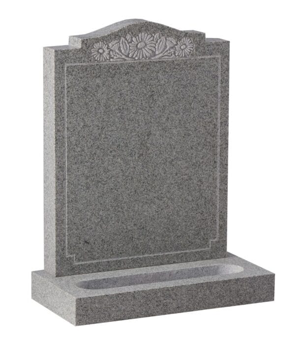 The WG176 Funeral Headstone features elegant deep sandblast daisies with a refined pin line and integrated planting trough. Crafted from premium Karin Grey granite, this dignified memorial offers a timeless tribute to your loved one.