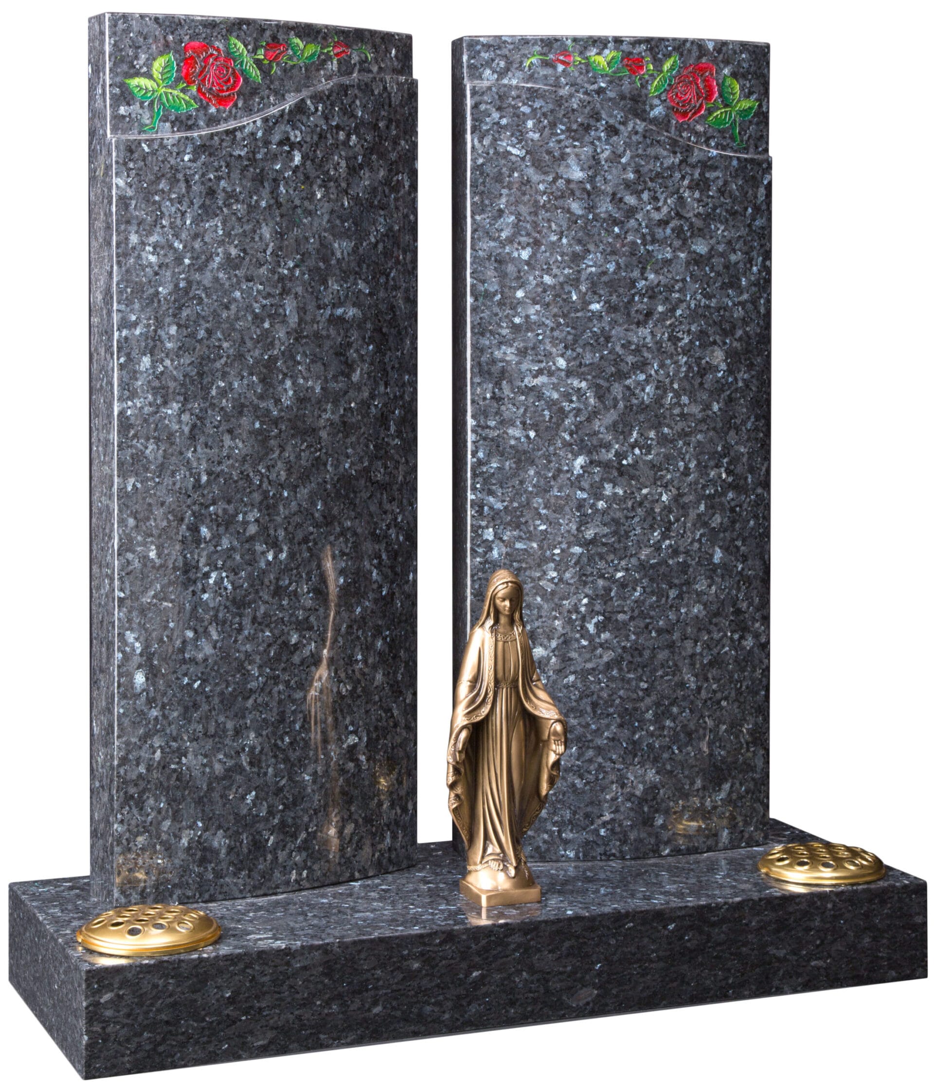 The WG203 Individual Monument in granite features twin columns with an ogee-shaped recess and a painted rose design. Available with an optional bronze ornament, this dignified memorial offers a timeless tribute to your loved one.