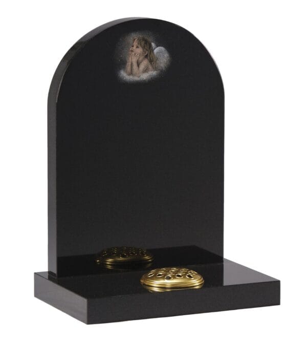 The WG226 Children’s Memorial features a half-round top headstone with a beautifully shadow-punched and painted cherub amongst clouds. This touching tribute creates a serene and peaceful memorial for a beloved child.