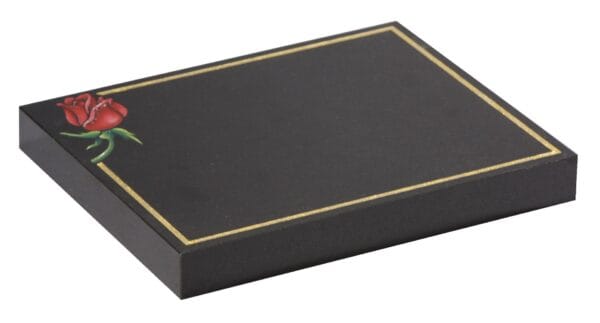The WG245 Cremation Tablet offers a dignified memorial for your loved one, featuring a delicately painted rose and elegant gold pin line border. Request a quote for this tasteful cremation memorial, available in various colours.